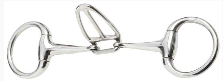 Bradoon style eggbutt with tongue control plate. The plate acts as a tongue layer to keep the horse from putting it's tongue over the bit, therefore allowing the rider to maintain proper control. Stainless Steel.