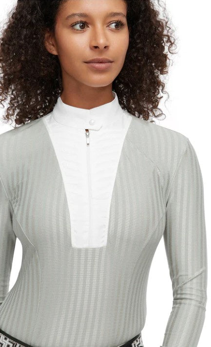 The Monaco shirt is designed for the competition arena with its lightweight sports stretch fabric and stylish pleated bib. It features a pearl button collar and a long sleeve cut for manoeuvrability. Perfect for warm weather, or under a competition jacket, the Monaco shirt is a must-have for any equestrian.