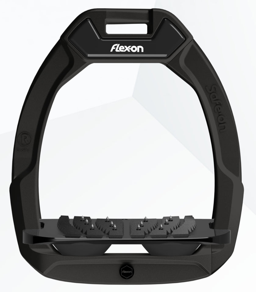 The Safe-on range by Flex-on is designed to reduce the risk of a rider's foot getting stuck in the stirrup in the event of a fall. It is a the forefront of the most up to date "breakaway" style, where the outer arm of the stirrup opens to release the foot when the rider's weight acts against it.