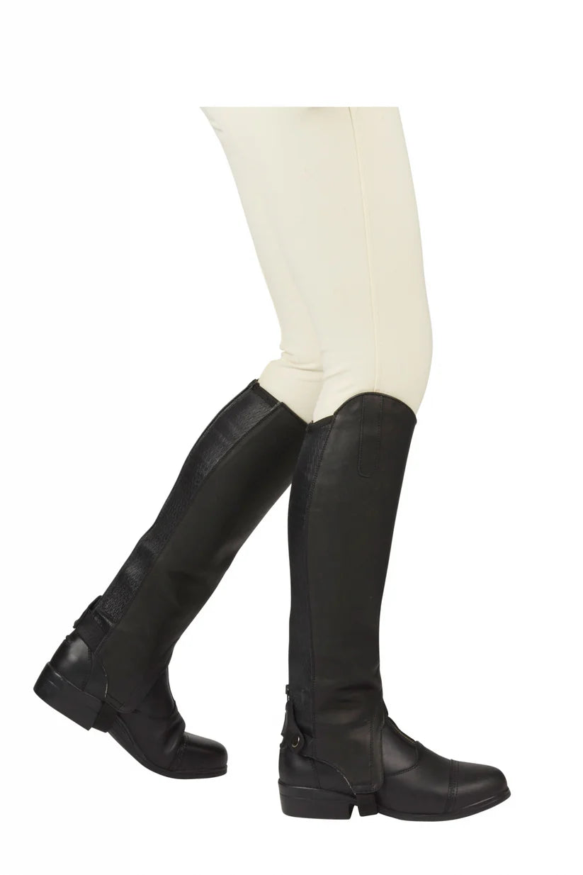 The Dublin Adult Meridian Half Chaps are made with soft waxy full-grain leather. These stylish and comfy chaps are leather-lined for close contact while riding and feature superior breathability. In addition the leather-look stretch panel provides a custom fit and comfort. This superior half chap is designed with a YKK back zipper for quality strength and durability. The stylish Spanish top elongates the leg while the leather and elastic pull tab provide convenience.