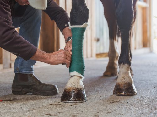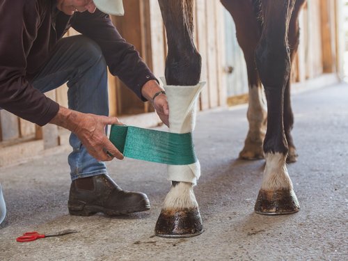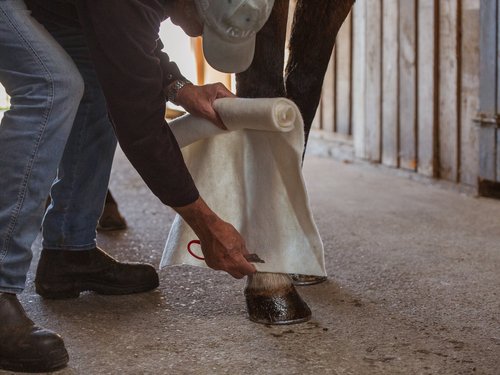 Measure and cut to the required size and place under the appropriate bandage. Take care to avoid creating pressure points under the bandage. When bandaging above the knee or hock, use a ‘relief' hole to relieve known pressure points at the joint.